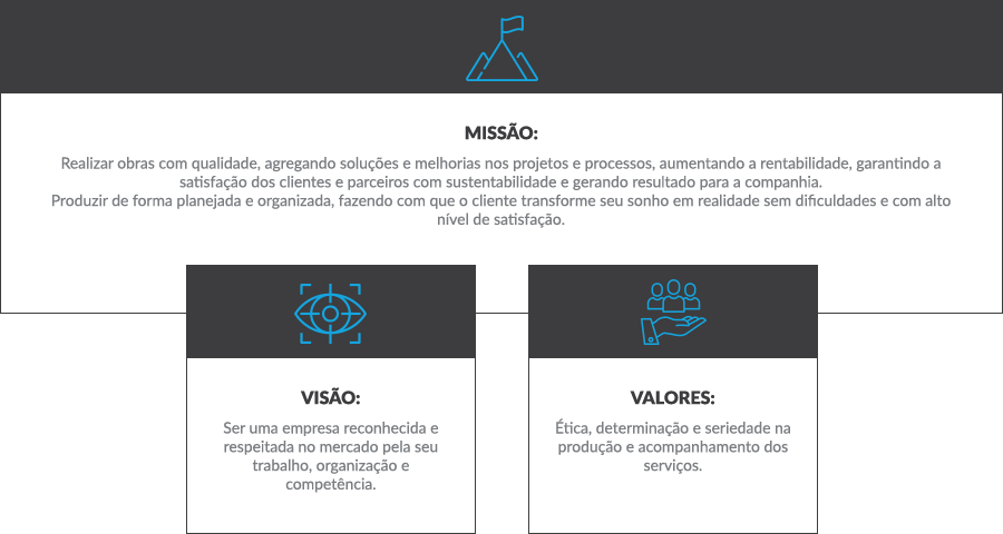 Realizar obras com qualidade, agregando soluções e melhorias nos projetos e processos, aumentando a rentabilidade, garantindo a satisfação dos clientes e parceiros com sustentabilidade e gerando resultado para a companhia.